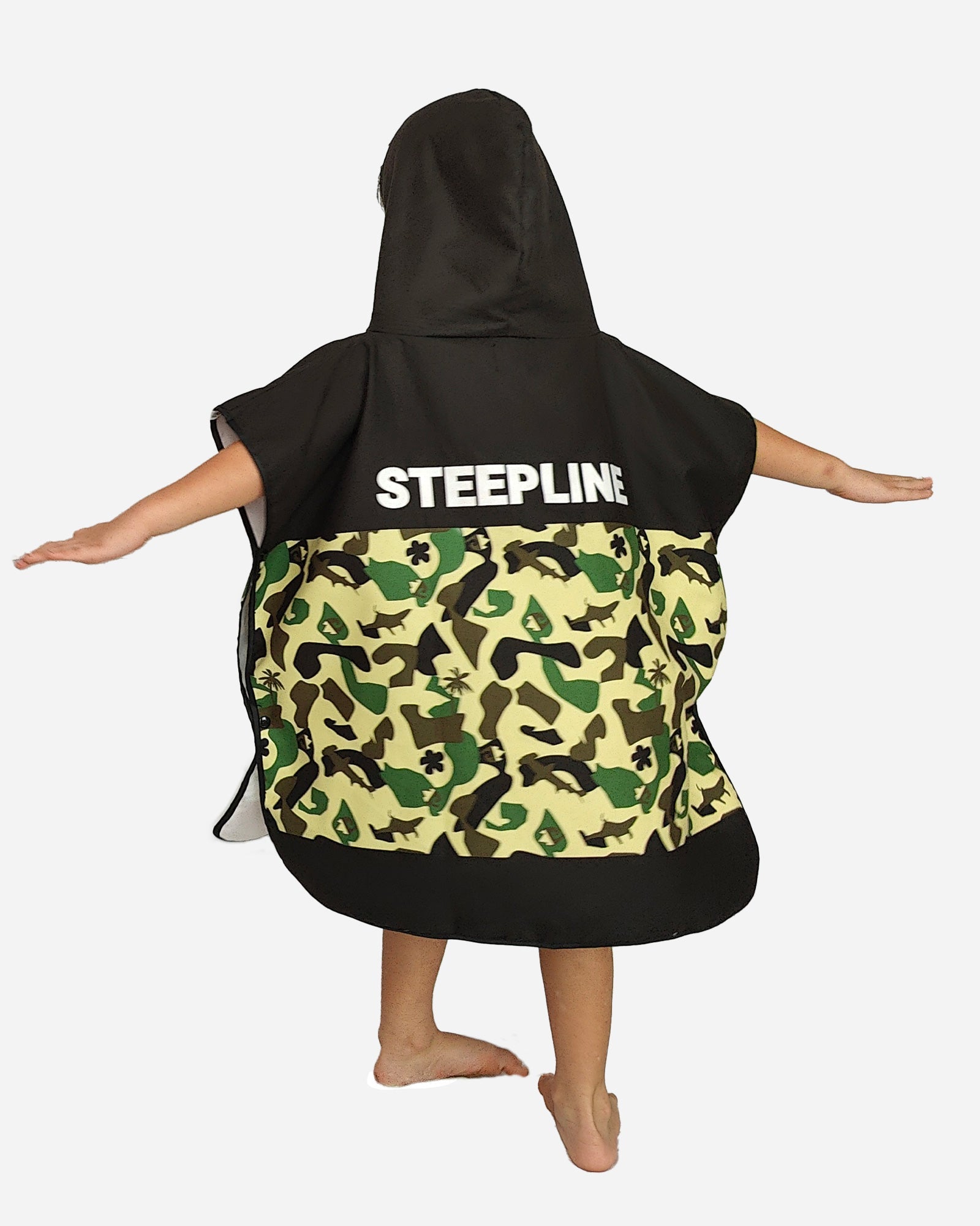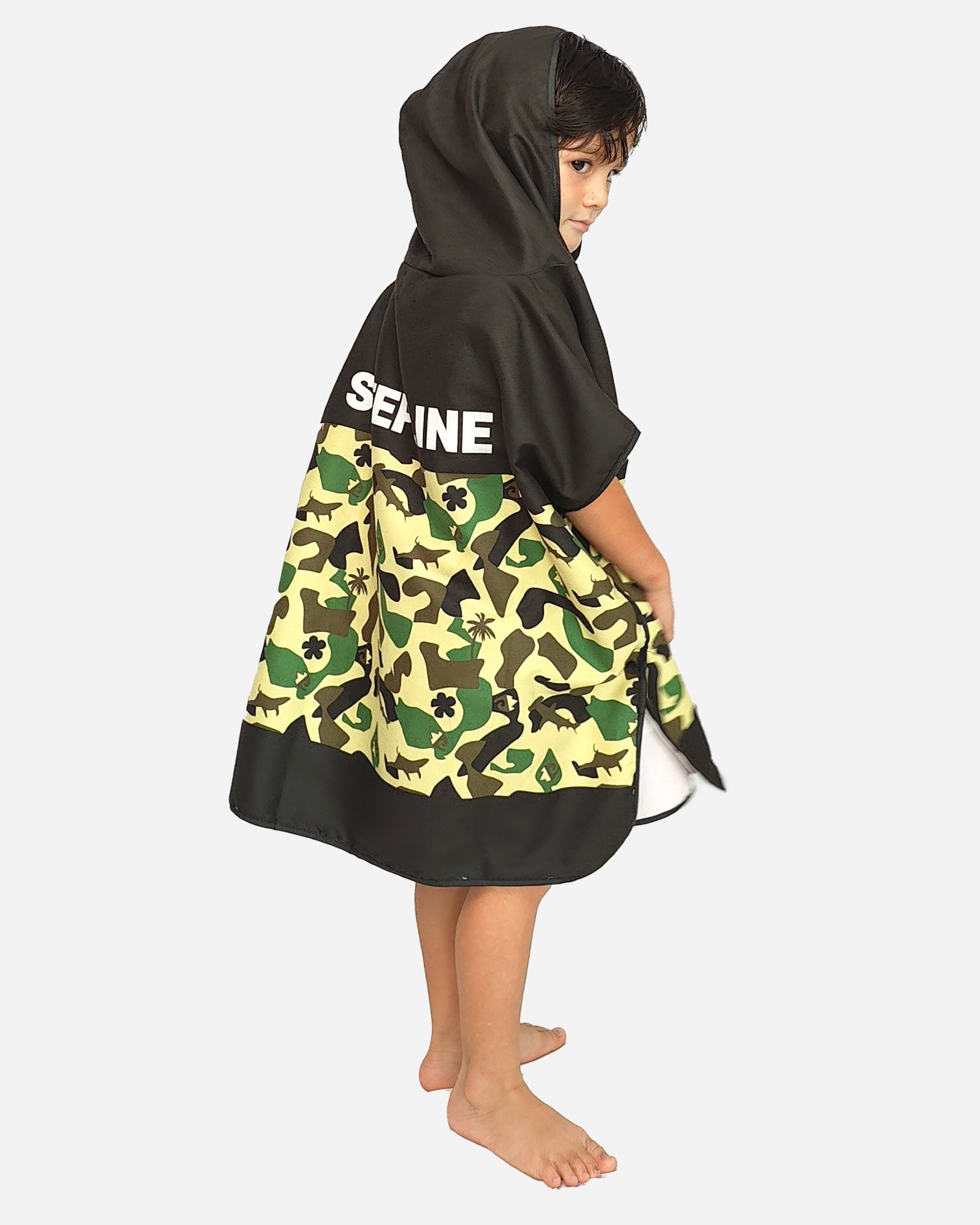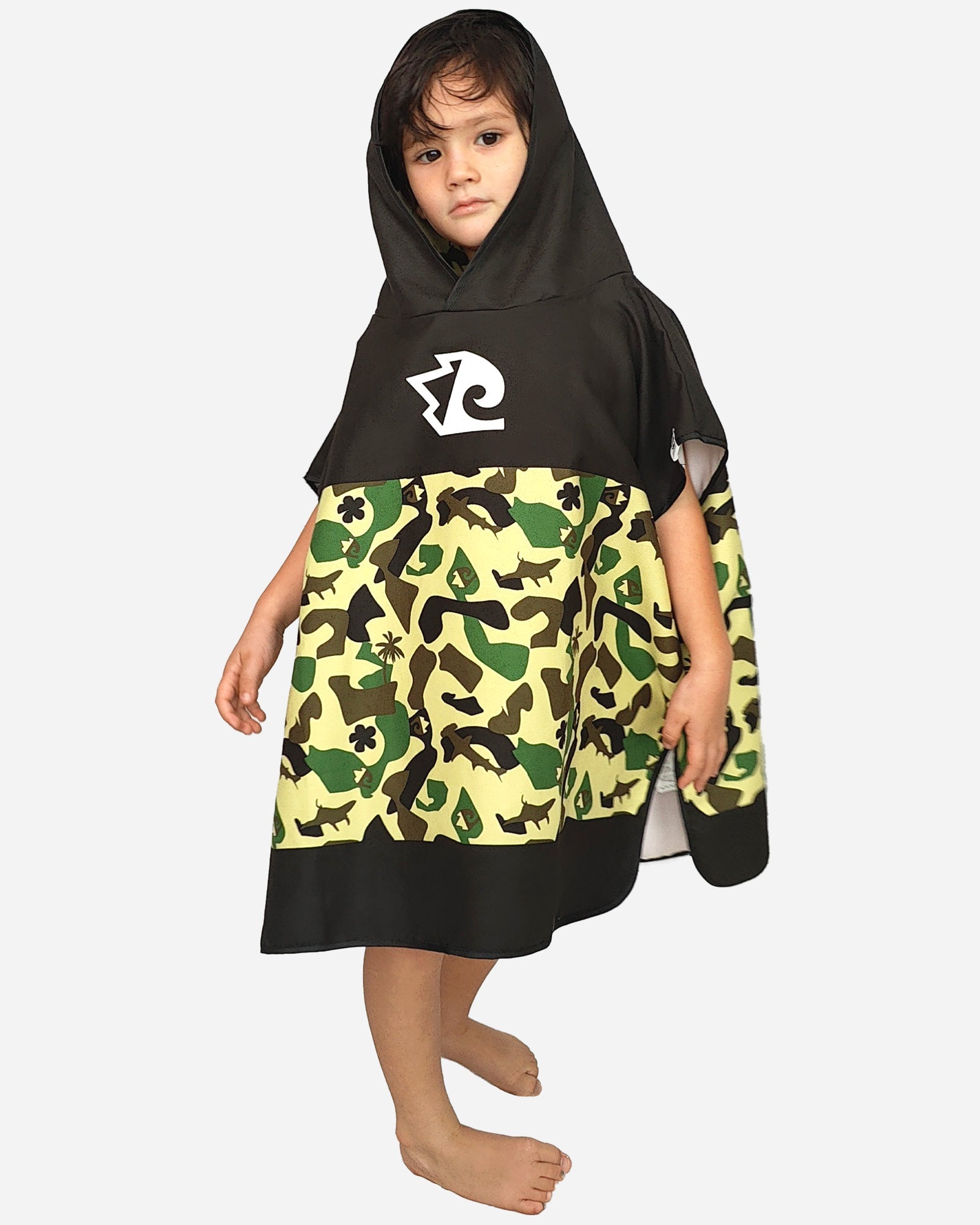 Introducing our Kids' Camo Surf Poncho, the perfect blend of fun and practicality for young beach enthusiasts. This poncho features a cool camouflage pattern with playful accents, making it both functional and stylish.